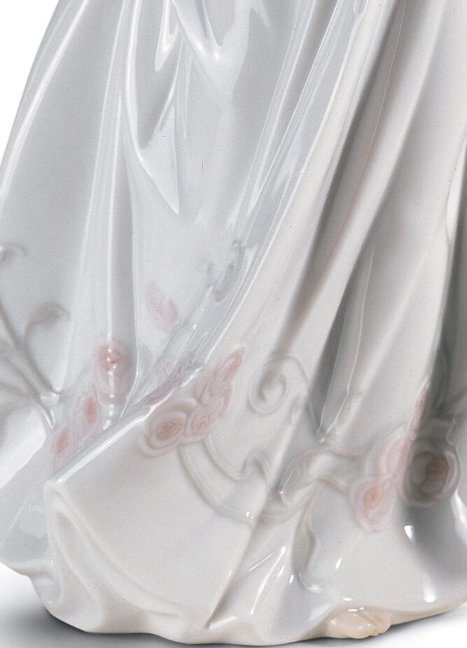Figura de porcelana brillo de mujer con un largo vestido blanco con motivos flores en tonos suaves y un pequeña caja en la mano lleno de flores.